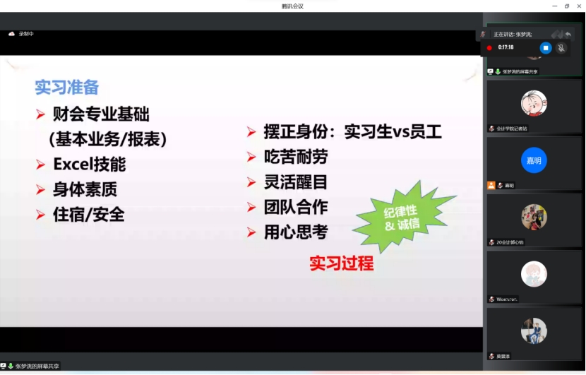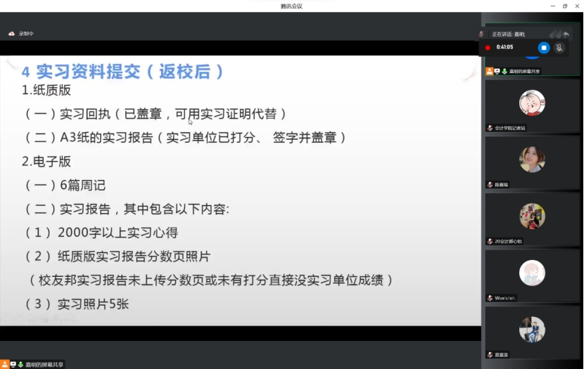12月7日,太阳成集团tyc7111(以下简称“我院“)依据我校《实习教学大纲》要求,在腾讯会议举行了2020级会计学实习动员会。我院会计学专业副主任张梦洮老师、辅导员付迪老师、李香香老师、教学秘书田嘉明老师出席了本次会议,2020级会计学A-E班、财务管理CIMA班的学生参与了此次动员会。
