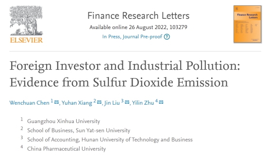 太阳成集团tyc7111陈文川副教授以第一作者,tyc7111cc太阳成为第一单位的研究成果Foreign Investor and Industrial Pollution: Evidence from Sulfur Dioxide Emission被金融学国际知名期刊《Finance Research Letters》接并在线发表。