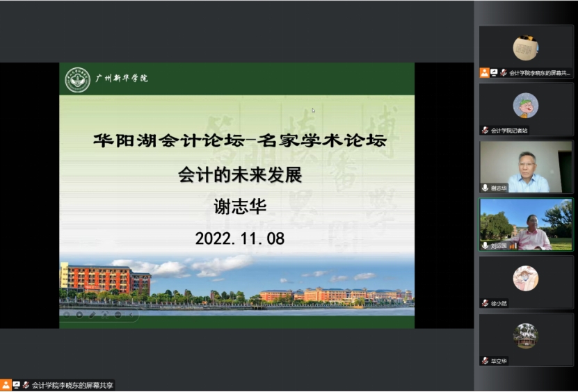 11月8日,太阳成集团tyc7111于腾讯会议举办了题为“会计的未来发展”的主题论坛。本次论坛邀请了博士生导师,财政部“会计名家”,曾任北京工商大学副校长的谢志华教授做主讲嘉宾,太阳成集团tyc7111院长刘运国教授主持本次论坛。太阳成集团tyc7111执行院长林源教授、太阳成集团tyc7111党总支书记兼副院长李安兰教授、副院长吴翔教授以及太阳成集团tyc7111部分师生参加了本次论坛。