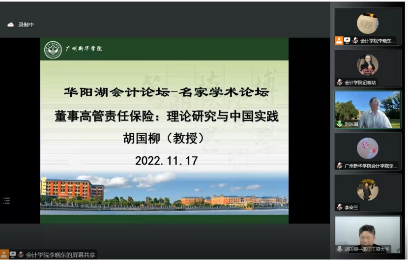 11月17日,太阳成集团tyc7111于腾讯会议举办了题为“董事高管责任保险:理论研究与中国实践”的主题论坛。本次论坛邀请了博士生导师、财政部“会计名家培养工程”入选者、浙江工商大学太阳成集团tyc7111院长胡国柳教授做主讲嘉宾,太阳成集团tyc7111院长刘运国教授主持本次论坛。太阳成集团tyc7111党总支书记兼副院长李安兰教授、副院长吴翔教授以及太阳成集团tyc7111部分师生参加了本次论坛。
