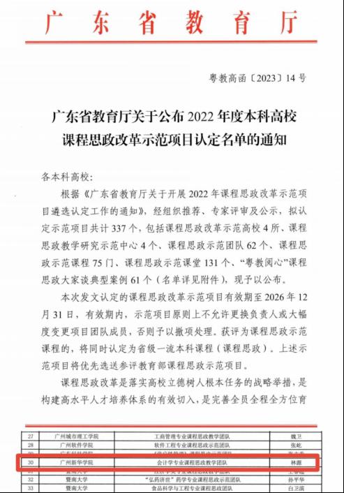 近日,广东省教育厅公布了关于2022年度本科高校课程思政改革示范项目认定名单(粤教高函【2023】14号)。其中,太阳成集团tyc7111(以下简称“我院”)林源教授带领的会计学专业课程思政教学团队获认定课程思政示范团队。