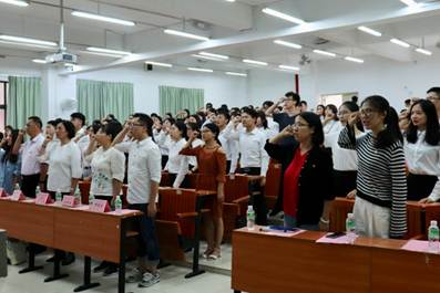 党总支副书记王沣老师带领新一批预备党员进行入党宣誓仪式,到场的其他党员同志一起重温入党誓词。