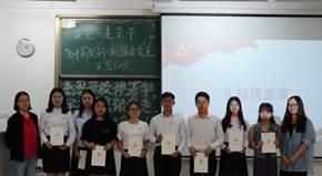 毕业生党员代表黎金燕同志、廖晋敏同志、刘英杰同志从实习经验、比赛经验及求职经历等方面分别做了分享,他们希望师弟师妹们重视自己的职业规划,提前做好相关准备;学会寻找比赛渠道,总结比赛经验,敢于挑战就是成功的一半,同时表达了对母校及师弟师妹的祝福。
