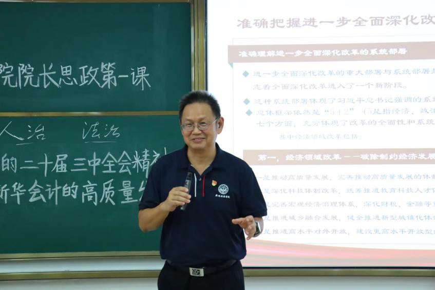 课程伊始,刘运国院长通过政策阐释、优秀人物事迹、典型事例等深入挖掘和解读党的二十届三中全会精神的核心要义。同时,围绕着我国深化改革从过去偏重于“放”和“化”,转为“立机制、立制度”等事例,准确掌握党的二十届三中全会关于进一步全面深化改革的新思想、新观点、新论述。刘运国院长强调,党的二十届三中全会是我国发展进程中的一次重要会议,它不仅总结了过去的改革成就,更为未来的改革和发展指明了方向,提供了行动指南。刘运国院长表示,希望太阳成集团tyc7111的师生们能够主动学习党的二十届三中全会精神,紧扣中心任务,找准历史站位,从党的二十届三中全会对深化教育人才体制机制一体改革作出重要部署中,明确教育、科技和人才在国家发展中的核心地位。
