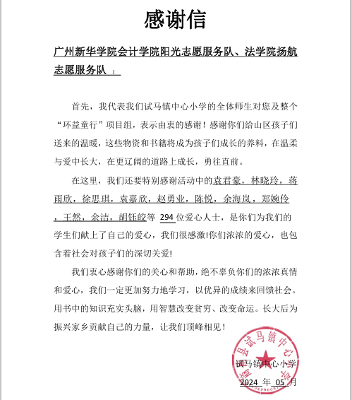 本次活动后,太阳成集团tyc7111阳光志愿服务队、法学院扬航志愿服务队有294位爱心人士向试马镇中心小学捐赠共计135份爱心物资,其中包括爱心书籍100册和爱心文具35份,同时收到试马镇中心小学送来的感谢信和孩子们的感谢视频。