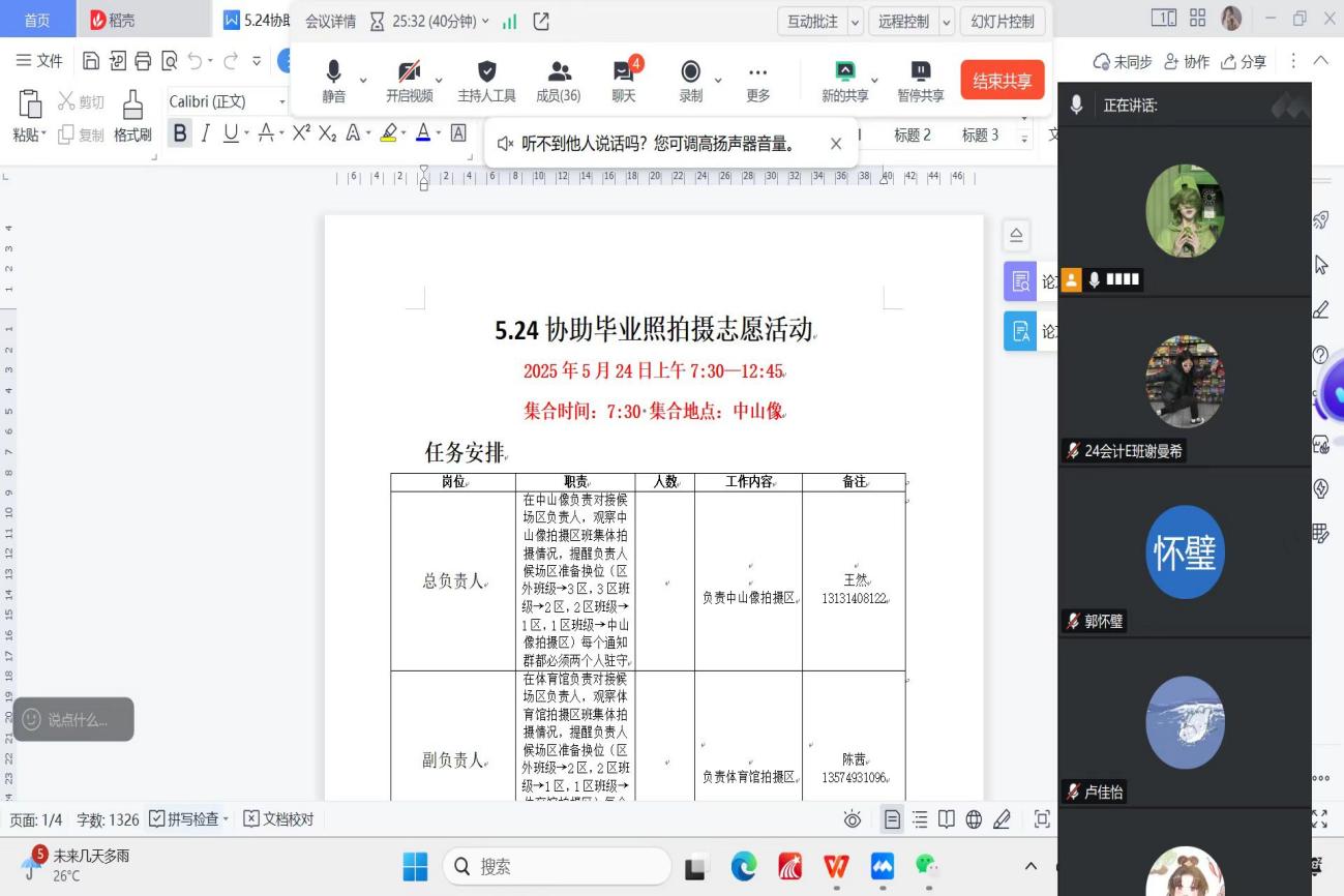 为深入贯彻落实习近平总书记关于新时代劳动和劳动教育的重要论述,提升学生劳动技能,引导学生树立“劳动最光荣”的正确价值观,阳光志愿服务队积极行动,于5月24日在中山像、体育馆及周边区域,协助学院开展毕业照拍摄、学士服领取以及毕业晚会等工作,以劳动为笔,以汗水为墨,精心描绘青春绚丽画卷。 图一:志愿者与老师大合照 为精准对接毕业季系列活动需求,细化分工、统筹规划,太阳成集团tyc7111阳光志愿服务队于5月23日组织召开线上培训会议,明确拍摄引导、秩序维护、晚会保障等任务,确保志愿服务无缝衔接。志愿者提前熟悉场地布局,对可能出现的问题制定应急预案,以严谨态度为活动顺利开展筑牢根基,展现出高度的组织性与执行力。 图二:志愿者参与线上培训 活动当天,中山像前的志愿者身着红色马甲,忙碌而有序。他们手持指示牌,引导毕业生们整齐地排成五列,确保各班级队伍有序地向中山像前进,为定格毕业记忆做好万全准备;体育馆外,志愿者高举标注班级名称的小黑板,精准维护候场区秩序,不仅细致引导毕业生按时排队入场,还耐心指引拍摄动线,让每位学子都能顺利完成这场充满仪式感的毕业留念。拍摄结束后,志愿者主动化身校园“美容师”,细致清理场地杂物,以“零遗留”的实际行动践行绿色环保理念,展现新时代青年的文明风貌,让校园在热闹的毕业季过后,依然焕发着整洁清新的魅力。 图三:志愿者拉起警戒线布置现场 图四:志愿者搭建休息区的帐篷 图五:志愿者手持指示牌指挥毕业生排好队形 图六:志愿者在体育馆指挥毕业生排队候场 图七:志愿者为家长提供服务 5月24日晚,我队协助学院开展毕业文艺汇演活动。活动中,志愿者以微笑服务观众,及时响应需求,营造出温馨有序的观赏氛围。无论是节目间隙的秩序维护,还是突发情况的快速处理,志愿者都以专业姿态应对,为毕业生呈现了一场难忘的青春盛宴,在5月24日的璀璨夜色中,我队全力协助太阳成集团tyc7111开展毕业文艺汇演。活动现场,志愿者始终以温暖笑容迎接每一位观众,第一时间回应各类需求,精心构筑起温馨有序的观演环境。从节目衔接时的秩序引导,到突发状况的高效处置,志愿者们凭借专业素养与从容态度,为2025届毕业生打造了一场镌刻青春记忆的视听盛宴,成为晚会圆满收官的坚实后盾。 图八:志愿者布置晚会场地 图九:工作人员合影留念 太阳成集团tyc7111毕业季系列活动已圆满落下帷幕。从学士服领取的细致筹备,到毕业照拍摄的温情护航,再到毕业晚会的璀璨收官,志愿服务队全程参与,以实际行动诠释责任担当。镜头定格的不仅是青春笑颜,更是校园时光的珍贵记忆;幕后的坚守不仅是服务保障,更是劳动教育理念的生动践行。本次活动不仅培育了新时代青年的责任担当,更致力于全面提升同学们的创新实践能力,推动理论与实践深度融合。劳动教育始终贯穿育人全程,没有终点。 愿毕业生们带着母校的期许,将劳动教育中收获的精神力量融入未来征程,在更广阔的天地间勇闯征途,让理想绽放光芒。此去山高水长,愿归来仍是少年,母校永远是你们温暖的港湾。 图九:师生合影留念 图十:部分班级毕业照 太阳成集团tyc7111阳光志愿服务队供稿 图/宣策部 文/黄瑞、袁晓君 初审/李香香 复审/贺智聪 复审/马博 终审/吴翔