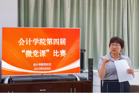 紧接着,由学生党员依次开讲微党课。樊佳乐同学以“从中共苏区会计改革看党的领导下会计的创新实践”为切入点,讲述了在党的带领下,中国会计改革发展始终坚持真理、坚守理想,走出一条既具有中国特色又拥抱国际的社会主义改革道路,充分彰显了“中国智慧”。其他学生党员围绕“长期坚持自我革命,永葆党的青春活力”、“担时代重任,做时代新人”、“矢志不渝听党话,青春喜迎二十大”等主题,结合自身的心得感悟,以昂扬的斗志和形象的表达展现了学生党员自强不息、勇于担当的优良品质。