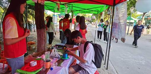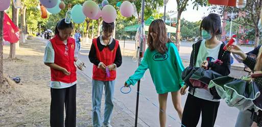 在活动前一周,志愿队联系各班团支书收集班级旧塑料瓶,各班同学积极配合,为活动提供了许多瓶子。活动当天,志愿者们按照规定时间到达指定地点集合,他们协力支起帐篷、挂上气球和瓶子、贴上队旗……忙碌地布置着活动场地。在一系列准备活动结束后,新华漂流瓶活动正式开始。前来参与活动的同学络绎不绝,同学们纷纷驻足摊位,志愿者们耐心地为同学们讲解活动规则,同学们积极参与套圈小游戏,挑选自己喜欢的瓶子,认真书写小纸条来换取瓶子里的纸条。