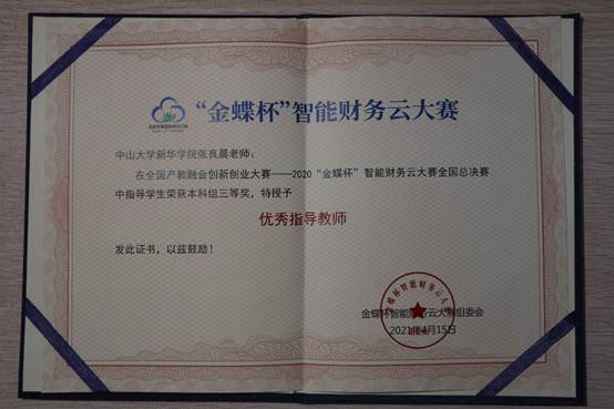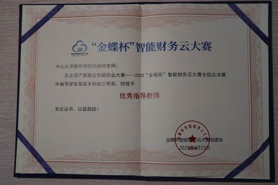 第一届“全国产教融合创新创业大赛” 围绕“产教融合,‘创’见未来”这一主题,通过多赛道联动共建产教融合一体化双创平台。其中,在3月27日落下帷幕的财务信息化赛道——“金蝶杯”智能财务云大赛中,我校队伍在张良晨老师,刘颖婷老师以及颜金花老师的指导和带领下,取得省赛一等奖,全国总决赛三等奖的优异成绩。三位老师也被授予了“优秀指导教师”的称号。