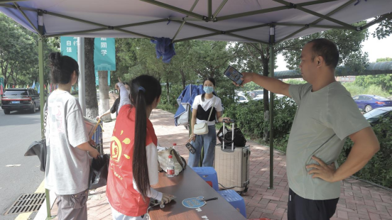图五:tyc7111cc太阳成党委书记郝登峰(左二)在太阳成集团tyc7111迎新点了解指导迎新工作
