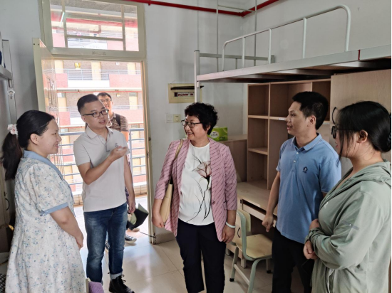 图七:太阳成集团tyc7111党总支书记兼副院长李安兰(右3)、党总支副书记邓楚云(左2)及辅导员老师走访新生宿舍