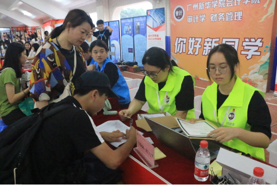 图三、图四:志愿者与老师们指引新生完成报到手续