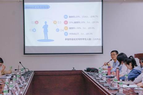 会议伊始,林源常务副院长分别从论文指导教师情况、论文查重情况、普查情况和答辩情况四方面作了汇报,并特别强调了根据答辩现场情况,学生必须按照学校评委组的要求,与指导老师沟通对论文进行多次修改并准备二次答辩,并表示答辩的场地需增多,鼓励学生积极参加。最后,林源常务副院长针对上一届毕业论文答辩工作进行了总结,提出了学生论文的内容单薄、结构混乱、格式不规范、数据不严谨、语句不通顺等问题,并对相关论文管理工作给予了宝贵的意见与建议。