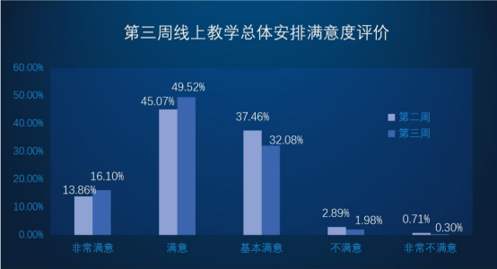 据面向学生的在线教学评价问卷调查结果显示,超过98%的学生认可教师课前准备情况和课堂表现,认为教师采取的线上教学形式和教学方法符合课程教学需要,在线课堂中能与教师交流通畅,能及时得到教师的指导与反馈,教师能够熟练运用所选线上平台进行教学活动;97.12%的受访学生对网络教学的体验表示满意,较上周同比略有上升。相对于直播和录播教学,更多学生认为包含直播、录播和答疑两种以上方式的混合教学模式更好。
