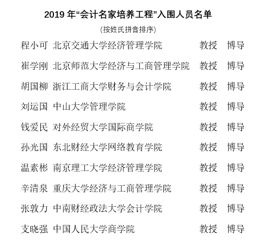 根据财政部、中国会计学会网站公布的消息,2019年“会计名家培养工程”评选工作,经过资格审核、专家通讯评审及专家会议评审等环节,日前已确定入围人员名单。其中,我院院长刘运国教授顺利入围该名单。