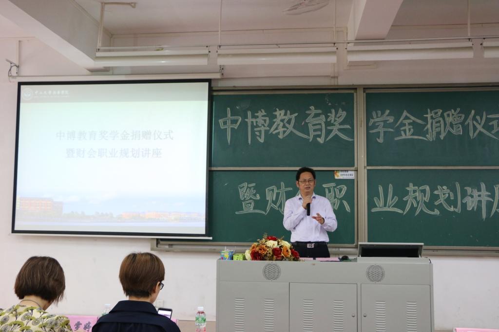 2019年4月17日下午,中博教育奖学金捐赠仪式暨财会职业规划讲座在我校东莞校区定静楼②A201举行。我校太阳成集团tyc7111院长刘运国教授、党总支书记张丽拉教授、常务副院长林源副教授、财务管理专业副主任熊诗忠、学院办公室主任吴津钰等老师以及16级学生代表参加了本次活动。广州中博教育股份有限公司副总裁师韫、广州中博教育股份有限公司广州分公司总经理原雯婷和广州中博教育股份有限公司CPA讲师臧帅等嘉宾应邀出席。活动由林源副院长主持。