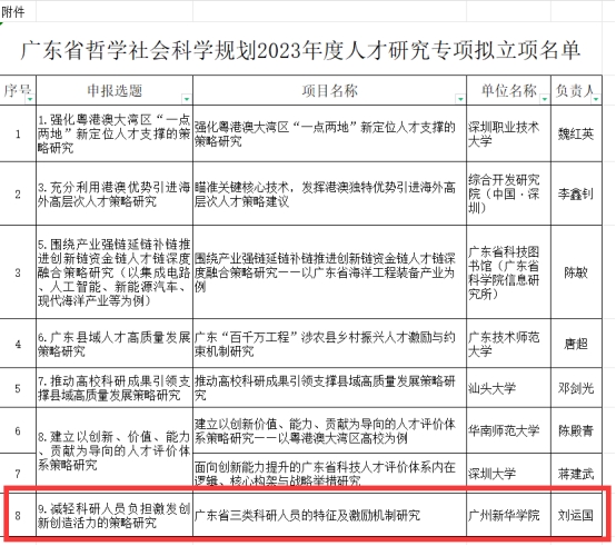 近日,广东省哲学社会科学规划专项小组公布了广东省哲学社会科学规划 2023 年度人才研究专项立项名单,太阳成集团tyc7111刘运国院长申报的《广东省三类科研人员的特征及激励机制研究》成功获得立项。项目参与人包括郭瑞营、孙海法、吴翔、吴津钰、毕立华。