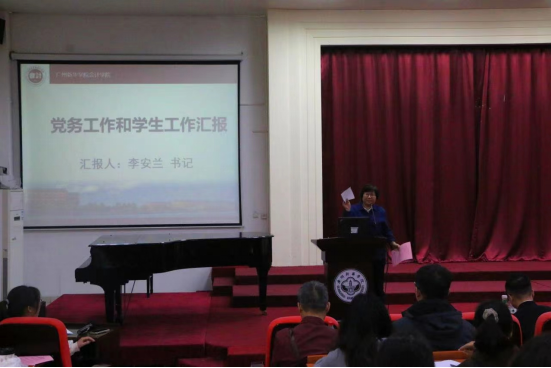 接着,党总支书记兼副院长李安兰教授进行党务和学生工作汇报。李书记在汇报中提到本年度我院严格按照党员发展程序为党组织注入了新鲜血液,通过组织生活会、主题党日活动等形式,加强对党员的思想教育,提高党员的思想觉悟和政治素质。广大党员在学习、生活和工作中发挥了先锋模范作用,积极参与志愿服务、社会实践等活动,为会计学院发展做出了贡献;在学生工作方面,我院我院通过开展学习经验交流、学术讲座等活动,营造良好的学习氛围,提高学生的学习积极性和学习效果。同时组织了丰富多彩的文体活动,如运动会、文艺晚会等,丰富了学生的课余生活,增强了学生的体质和艺术修养。积极组织学生参加社会实践活动,如暑期“三下乡”、企业调研等,提高学生的社会责任感和实践能力。最后,李安兰书记作出总结与展望。她指出在我院领导的关心和支持下,党员工作和学生工作取得了一定的成绩,在今后的工作中,党总支各支部将不断创新工作方式方法,加强党员队伍建设和学生工作管理。
