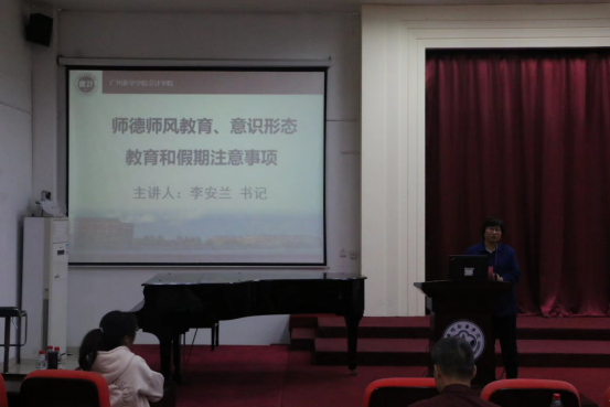 随后,李安兰书记就树立师德师风为主题提出了几项要求。李安兰书记表示新时代高校教师职业行为十项准则为坚定政治方向、自觉爱国守法、传播优秀文化、潜心教书育人、关心爱护学生、坚持言行雅正、遵守学术规范、秉持公平诚信、坚守廉洁自律、积极奉献社会,希望老师们严格遵守师德师风要求,立足本岗,以身作则,真正做到学为人师,身正为范。