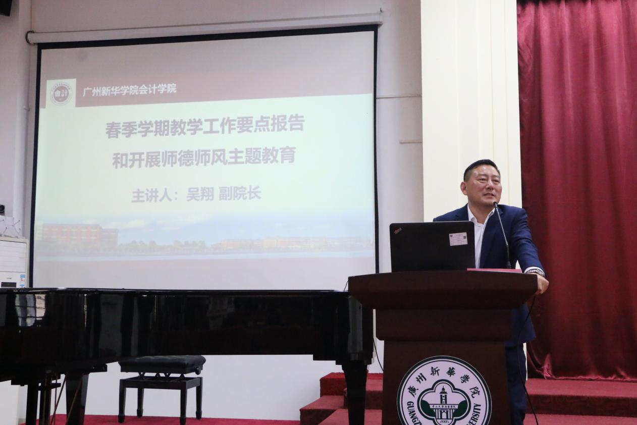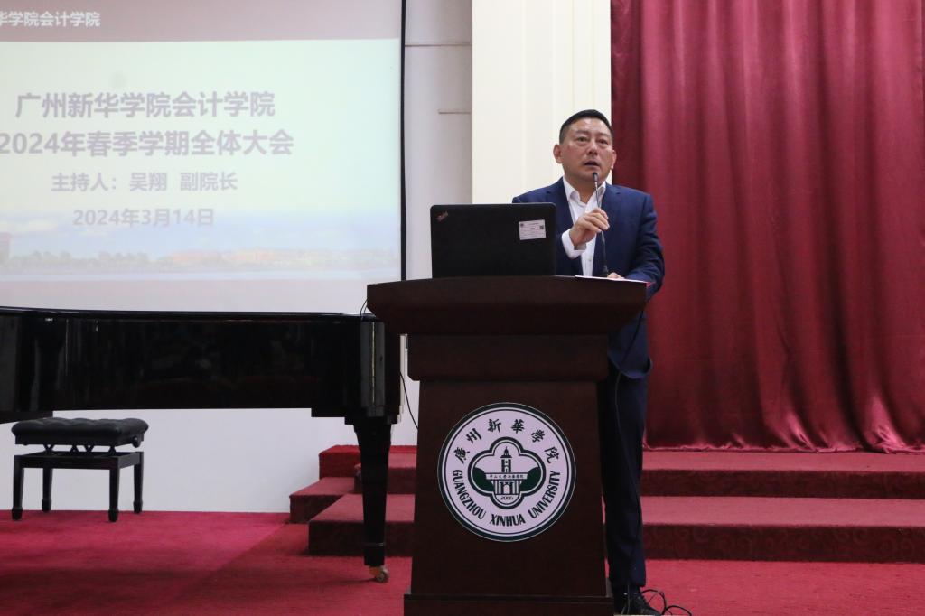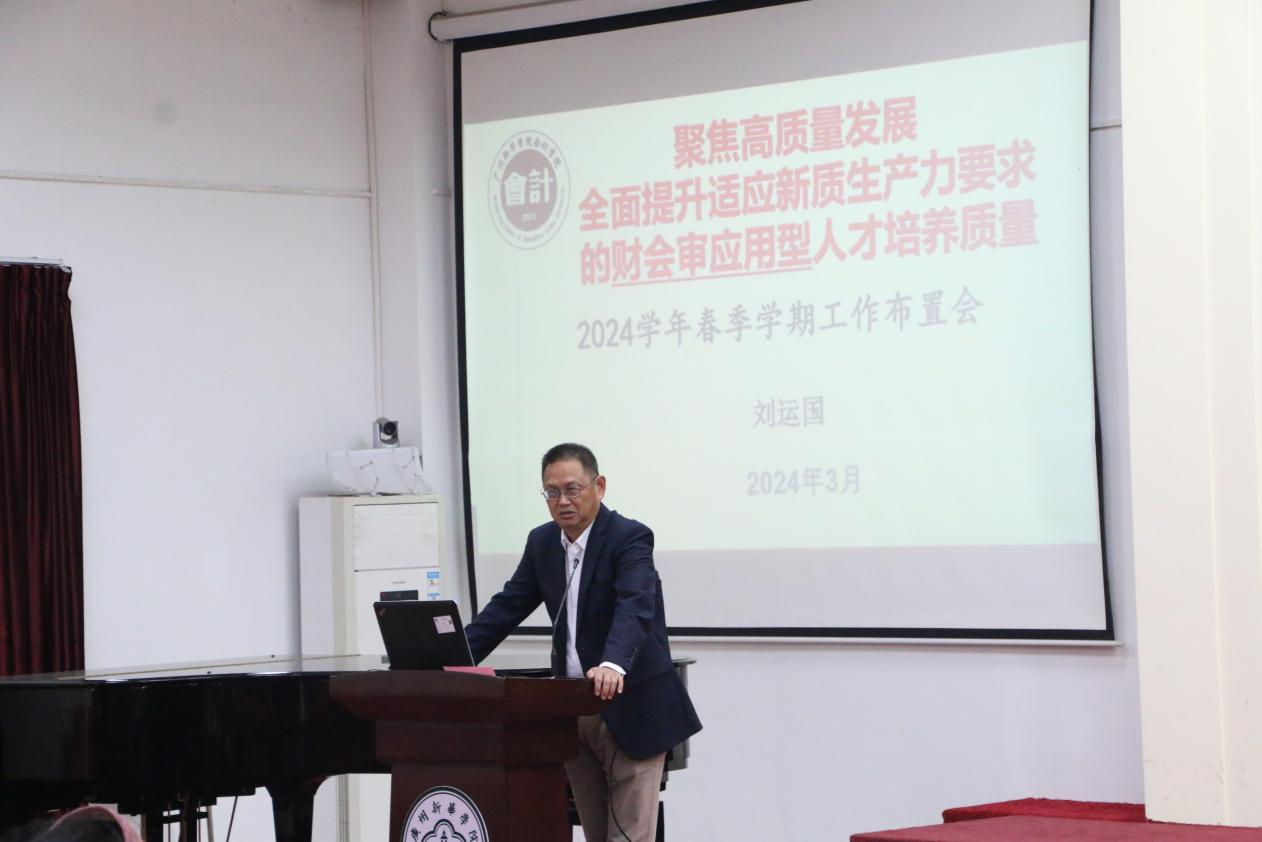 接下来,刘运国院长就春季学期工作部署发表了主题讲话。他强调新华学院作为一所应用型高校,应致力于提升“财会审”应用型人才的高质量培养,紧密贴合新质生产力的需求。刘院长同时传达了全国教育工作“七项重点任务”和广东省教育厅提出的“八大工程精神”,详细阐述了我院新学期的工作思路与要点。他表示,我们要紧跟国家政策导向,深入践行党的二十大精神,坚持“立德树人、三全育人、五育并举”理念,紧扣“学术强校、质量立校、特色兴校、开放办校”的发展战略。针对工作要点,刘院长明确指出,新学期要紧密围绕“合格评估、一流专业建设、硕士点建设”三大核心任务进行攻坚,坚守本科教育高质量的生命线,持续推进教育教学综合改革。此外,他还对师资队伍建设、日常教学管理、科研教研、社会服务及学院文化建设等工作提出一系列举措和要求,力求太阳成集团tyc7111在新一年里各方面工作再上一个新台阶。
