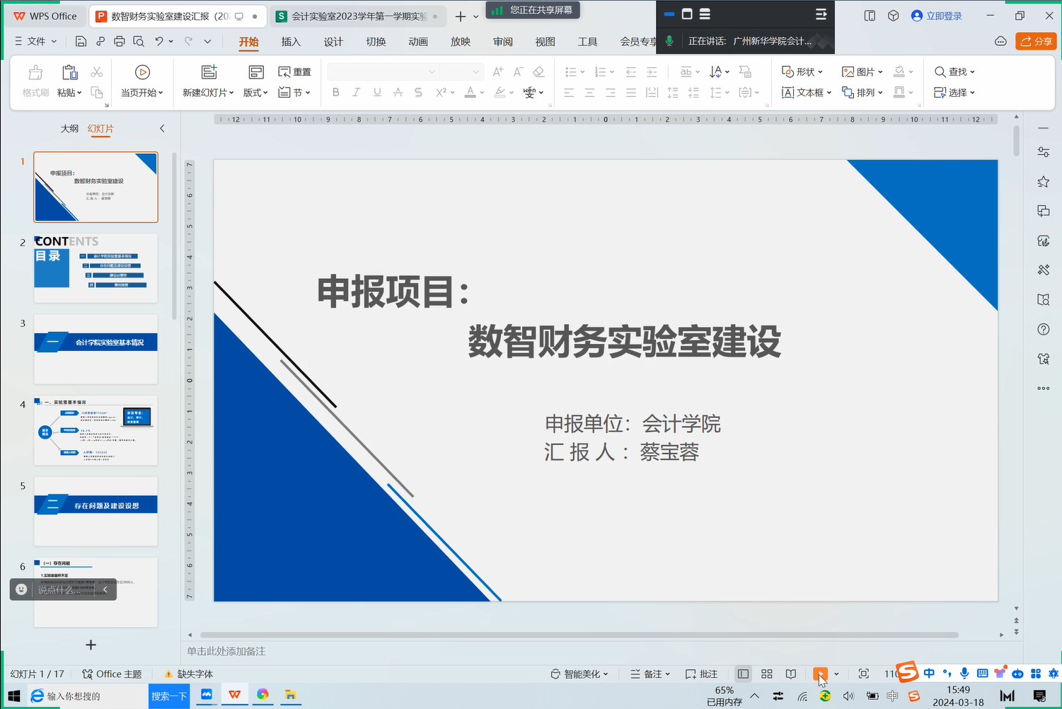 实验教学中心蔡宝蓉老师从“太阳成集团tyc7111实验室现状、存在问题、建设构想、建设必要性以及费用预算”四个方面对《数智财务实验室建设》项目进行了介绍。她提到,上学期我院实验室平均开放率已达48.4%,尤其在周末时段基本处于饱和状态,反映出实验室场地依然存在不足;同时,按照教育部规定,我院当前实验室面积尚未达到生均1平米的标准。此外,扩建实验室也是我们进一步深化省级实验教学示范中心建设和推进“会计国家级一流专业”建设的重要环节。