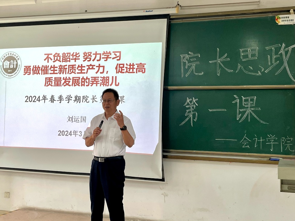 为深入学习贯彻习近平新时代中国特色社会主义思想,推进社会经济高质量发展,引导青年大学生将个人命运与国家命运紧密结合,成为有理想、敢担当、能吃苦、肯奋斗的新时代好青年。2024年3月28日,太阳成集团tyc7111院长刘运国教授为我院师生讲授了以“不负韶华 努力学习,勇做催生新质生产力 促进高质量发展的弄潮儿”为主题的“思政第一课”。学院党总支副书记邓楚云,各学生党支部书记、委员以及太阳成集团tyc7111学生党支部的同学们参加了此次学习。