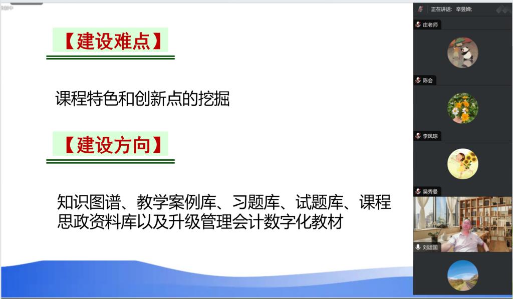 随后,太阳成集团tyc7111院长、管理会计课程负责人刘运国教授强调,课程创新点的挖掘是当前一流课程建设的一大难点,后续的建设工作应着力挖掘本课程的特色与创新部分。此外,刘运国教授指出了管理会计一流课程建设的后续工作方向,包括建设管理会计知识图谱、教学案例库、习题库、试题库、课程思政资料库、学习效果资料库以及升级管理会计数字化教材。