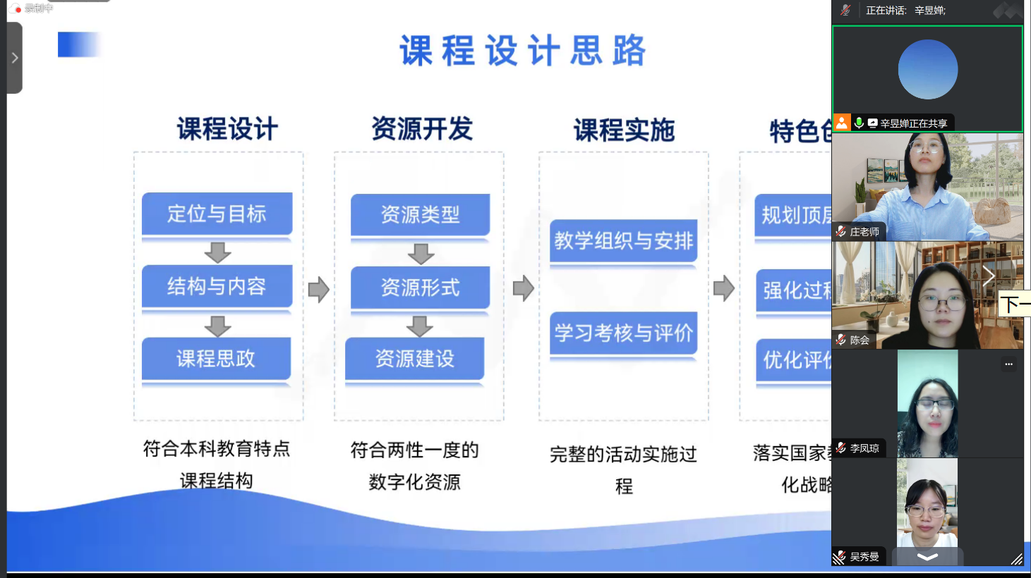 会议伊始,网中网辛昱婵老师详细介绍了目前数字化课程建设政策纲领、课程建设要点、课程设计思路及具体建设路径,为课程团队的老师们描绘关于本门课程建设的蓝图。