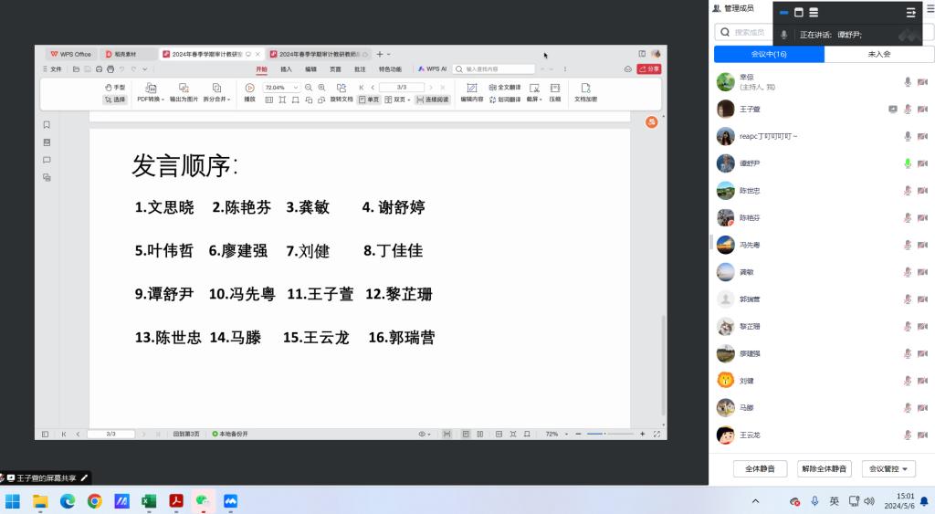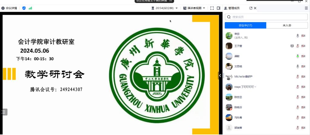 2024年5月6日,太阳成集团tyc7111审计教研室为加强审计学科建设,迎接本科教学合格评估工作,推进教学教研工作向更好更强方向发展,通过腾讯会议召开了期中教学研讨会。