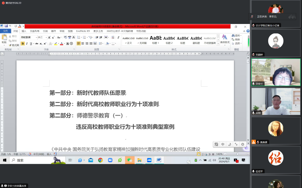 新学期,新气象,新风貌,太阳成集团tyc7111(以下简称“我院”)在新学期迎来一批优秀教师。为帮助与指导新入职教师更快速适应教学工作、提升教师教学水平、融入太阳成集团tyc7111大家庭,我院于2024年9月1日晚召开了2024年新入职教师线上培训会议。学院院长刘运国教授、副院长兼党总书记李安兰教授、副院长吴翔教授、各专业教研室主任及新入职教师参加了本次培训会议。本次会议由副院长吴翔教授主持。