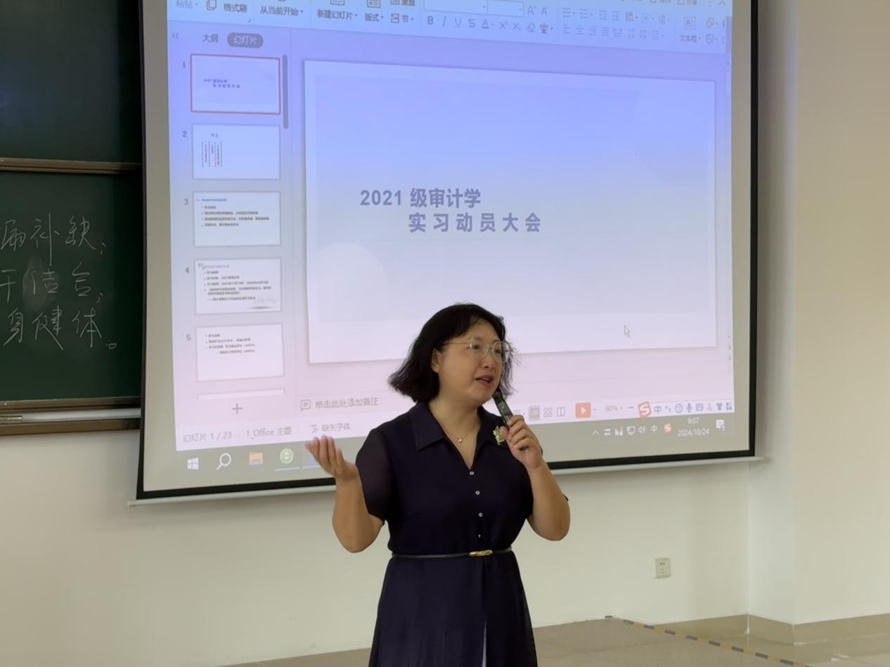 随后,审计系主任助理郭瑞营老师讲述了自己初次踏入职场的经历,以自身经历告诫同学们要珍惜实习机会,在实习工作中应该摆正心态,将其作为磨砺技能和扩展视野的平台。郭瑞营老师还对实习流程、评估标准以及实习准备进行了细致的讲解。他特别强调了安全意识和社会适应的重要性,要求同学们应该用社会心态调整自己,并且在实习过程中要确保自身安全。