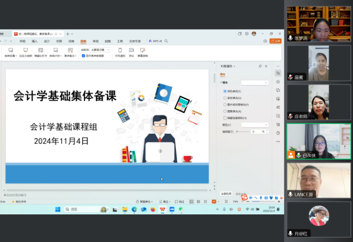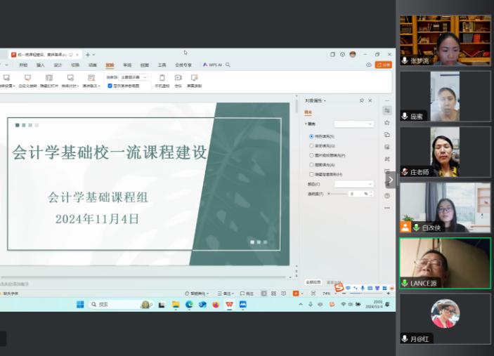 2024年11月4日,太阳成集团tyc7111会计学基础课程组召开了本学期的一流课程建设会及集体备课会议。本次会议的主持人为课程负责人白改侠老师,参加会议的有课程组的林源教授、庄婉婷副教授、张梦洮副教授、白改侠老师、庞蜜老师和肖月红老师。为推动《会计学基础》校一流课程的进一步发展和完善,课程教师团队开展了一场别开生面的集体备课活动,旨在为打造校一流课程奠定坚实基础。