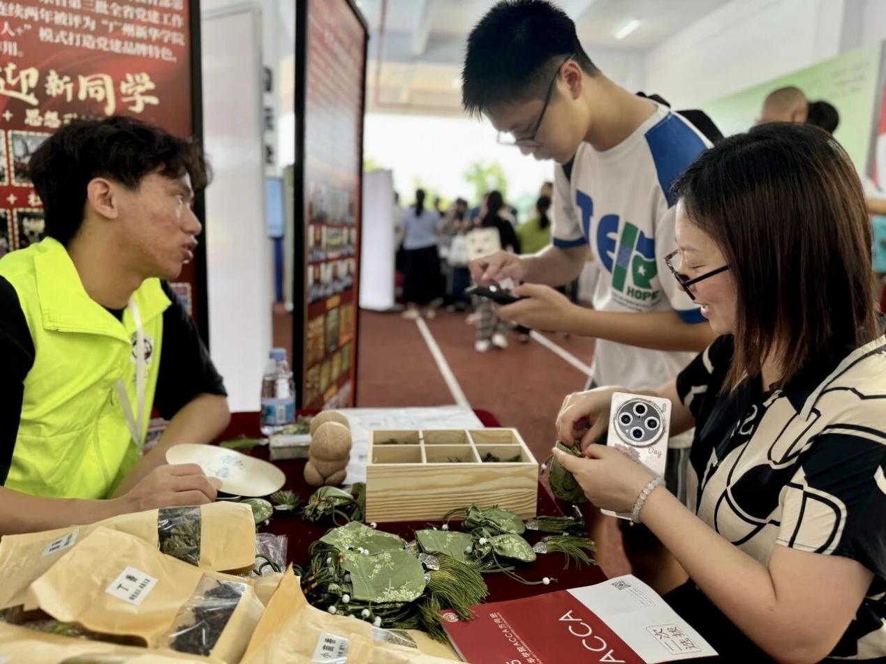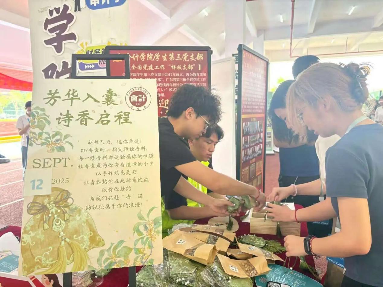 此外,学院在迎新点设置摊位开展“芳华入囊、诗香启程”活动,为参与者介绍丁香、豆蔻、薄荷等香草的功效与药用价值,详细讲解香囊制作方法,将中国传统香文化与防蚊卫生宣讲相结合,与新生共赴“香”遇、守护健康。