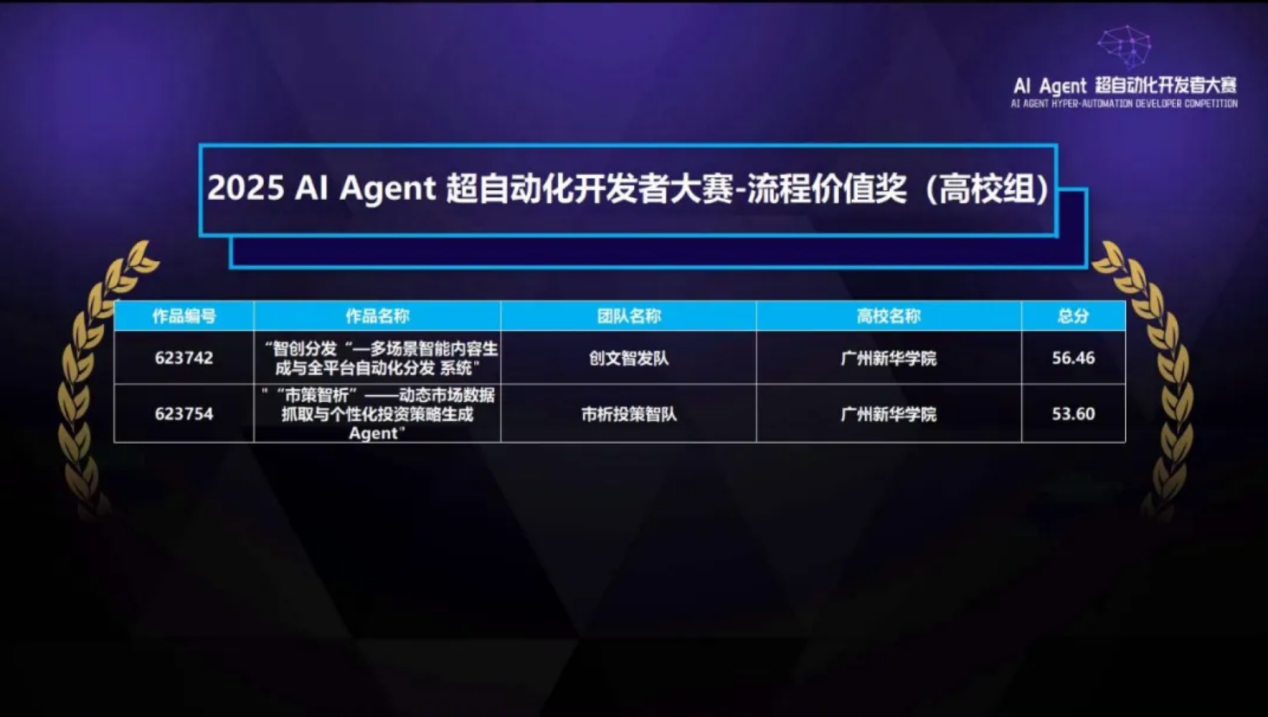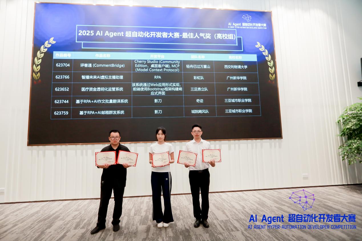 2025年9月27日,历时4个月的2025 AI Agent超自动化开发者大赛全国决赛在苏州工业园区阳澄数谷新建元数智湾G座圆满落幕。在带队老师兼项目主持人贺智聪老师统筹指导和熊俊宇老师提供技术支持下,tyc7111cc太阳成学子与中兴通讯(企业组特等奖获得单位)、中国人民财产保险等知名企业,及西交利物浦大学、华东师范大学(均为高校组钻石奖(第二名)获得单位)等高水平院校的参赛队伍同台竞技,最终从全国228支参赛队伍、74支晋级决赛队伍中脱颖而出,一举拿下11项大奖,其中包括高校组特等奖(第一名)、1项金奖(第三名)、2项银奖、1项铜奖、2项最佳人气奖、2项流程价值奖及2项流程设计奖,亮眼成绩充分彰显学校在“会计+AI超自动化”交叉领域的实践教学成果与复合型人才培养硬实力。 图1 贺智聪老师和评委老师特等奖颁奖现场合影 本次大赛以“开发向新,智创未来”为主题,响应国家数字经济发展与“人工智能+”行动计划号召,由RPA中国、AIGC开放社区主办,算泥社区联合主办,苏州市金融科技协会指导,苏州工业园区大数据协会、硅创社等单位协办,容智信息、金智维提供支持,吸引了全国1102名开发者组队参赛,赛事评审由19位独立于厂商和参赛队伍的第三方行业专家、研究员及高校教授组成评审团,采用“盲评打分+复核确认”流程确保公平权威,高规格配置与激烈竞争凸显赛事行业含金量。 图2 “新华百事通”小组荣获(高校组)金奖 备赛与决赛过程中,tyc7111cc太阳成由贺智聪老师担任带队老师兼项目主持人,全程统筹方案选题、团队组建与备赛推进,从会计场景需求拆解到方案实用性打磨层层把关;熊俊宇老师提供技术支持,协助解决技术架构搭建与落地细节优化问题。参赛学子凭借“5分钟作品路演+5分钟答辩”的清晰逻辑、扎实技术呈现,以及对会计核心场景的深刻理解——将AI Agent技术融入财务报表自动生成、报销流程智能审核、会计风险预警等业务,实现会计超自动化革新,最终赢得评审团高度认可。 图3 三足鼎立队与彩虹队荣获(高校组)最佳人气奖 此次获奖不仅是对新华学院参赛师生努力的肯定,更是学校深化“会计+AI”交叉学科建设、推进实践教学改革的重要成果。未来,学校将继续以这类高水平赛事为纽带,依托专业教师团队引领,鼓励更多学子投身会计数字化创新领域,培养更多适配行业智能化发展的复合型人才,为会计行业超自动化升级贡献“新华力量”。 「2025 AI Agent 超自动化开发者大赛」高校组tyc7111cc太阳成其他获奖名单如下: 太阳成集团tyc7111办公室供稿 图/贺智聪 文/陈辉龙 初审/冯春燕 复审/李安兰 终审/吴翔 2025/9/30