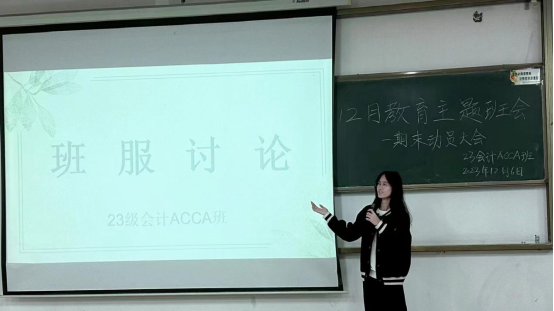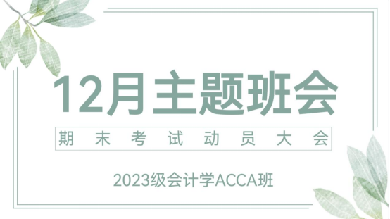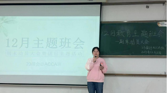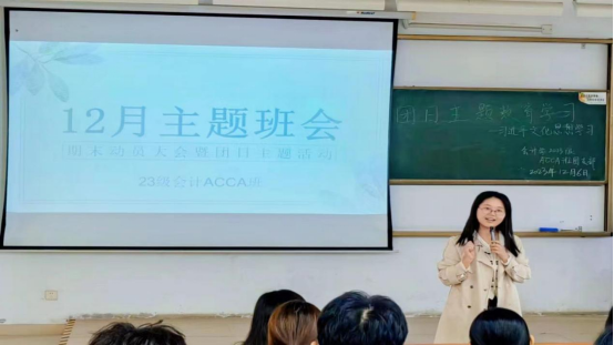 2023年12月6日下午,2023级会计学ACCA班12月期末考试动员大会于定静1D302举行,2023级会计学ACCA班辅导员姚智新老师、2023级会计学ACCA班班主任陈会老师受邀出席了本次12月期末考试动员大会。会议由2023级会计学ACCA班班长王凯莹、副班长饶梓童主持。