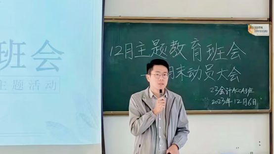 紧接着,2023级会计学ACCA班辅导员姚智新老师进行了12月期末考试动员大会讲话,他表示要诚信考试,不能抱有作弊等侥幸心理,并再次向同学们明确了请假的要求。他还呼吁同学们努力学习,争取“三好学生”和“优良学风班级”等的奖项评比,并提醒同学们不要随意在网络上发声。