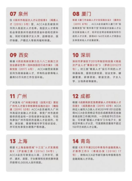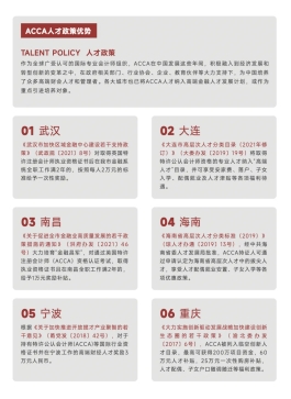 作为全球广受认可的国际专业会计师组织,ACCA在中国发展这些年间,积极融入到经济发展和转型创新的变革之中,在政府相关部门、行业协会、企业、教育伙伴等大力支持下,为中国培养了众多高端财会人才和管理者。各大城市也已将ACCA人才纳入高端金融人才发展计划,或作为重点引进培养对象。